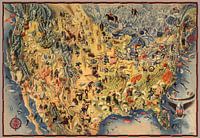 Kaart in vogelvlucht van de Verenigde Staten met delen van Canada en Mexico. Op verso: beschrijvende tekst: Miguel Covarrubias. Geschatte datum. Decoratieve cartouche met een schild van een Amerikaanse adelaar, bekroond door een banier met lint met de titel van de kaart. Toont natuurlijke kenmerken, bergketens, bomen, landbouwproducten, industrie, vliegtuig, schepen en vaartuigen, vissen in de oceanen, bloemen en huisdieren van verschillende regio's zoals een krab in Maryland, een flamingo in Florida, en cactussen in de woestijn Southwest. Wolkenkrabbers van de grote steden en oriëntatiepunten zoals het Vrijheidsbeeld worden getoond. Een Canadese berg, inheemse Amerikanen en cowboys zijn afgebeeld in de regio's waarmee zij geassocieerd worden. Kompasroos linksonder. Reliëf picturaal weergegeven.