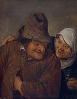 Het kunstwerk toont twee boeren, een man en een vrouw, dicht bij elkaar. De man, met een bruine hoed en jas, heeft zijn arm om de schouder van de vrouw. De vrouw, met een witte hoofdbedekking, houdt een klein glas vast. Hun uitdrukkingen suggereren een gedeeld moment van intimiteit of misschien wel een gedeeld drankje. De stijl van het…