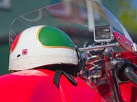 Gelegen op een klassieke Ductai 250cc Mono-Clinder met stuurkuip, Gezien tijdens de Classic TT op het industrieterrein "Het Talent" in Winsum Groningen.