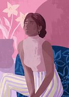 Daydreaming is een illustratie van een vrouw, dagdromend op een blauwe stoel met bloemenprint. Het is speels geschilderd met losse streken. De illustratie heeft een roze met paars palet. Op de achtergrond staat een moderne vaas met lelies.