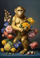 De gedetailleerde texturen van zowel de bloemen als de aap, gecombineerd met de verfijnde lichtval, geven het kunstwerk een bijzonder gevoel van diepte en realisme. Dit werk nodigt de kijker uit om stil te staan bij de relatie tussen het natuurlijke en het surrealistische, waarbij de vergankelijkheid van bloemen wordt gecontrasteerd met de tijdloze uitstraling van het gouden wezen. Dit kunstwerk zou niet misstaan als eyecatcher in een modern interieur, waar het een gevoel van mystiek en verwondering zou oproepen.