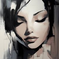 Het gezicht, met gesloten ogen, lijkt niet te slapen maar te rusten in volledige overgave. De schaduwen kussen de contouren van de huid, terwijl de penseelstreken vloeiend in elkaar overgaan, alsof elke streek een zucht is, een beweging tussen loslaten en blijven. De bruine tonen geven de compositie een tastbare warmte, een menselijke nabijheid — alsof de stilte zelf huid is geworden.