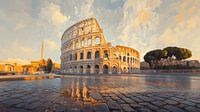 Het Colosseum baadt in zacht licht (pastel), alsof het ademt na een lange dag. De ronde vormen lossen op in pastelblauw en warm oker. Kleine scheuren en verweerde stenen vertellen een verhaal van tijd, strijd en schoonheid. En de prachtige reflectie on de straten.