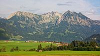 Prachtig uitzicht vanuit Sonderdorf (gemeente Bolsterlang) over Oberdorf (gemeente Obermaiselstein) naar de Allgäuer Alpen met Rubihorn, Gundkopf, Nebelhorn en Entschenkopf. Hörnerdörfer, Oberallgäu, Allgäu, Zwaben, Beieren, Duitsland. Genomen in de zomer van 2020.