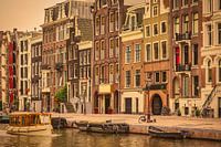 Uniek klassiek hedendaags beeld zonder auto's van een Amsterdamse gracht met voorbij varende klassieke rondvaartboot