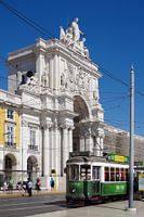 Lissabon, Arco da Rua Augusta op het Praça do Comércio. Voorafgaand aan de "Tram Tour" zijn er tramwagens voor toeristische rondleidingen.