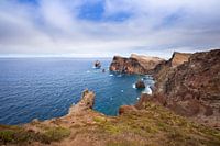 De golven van een blauwe zee breken tegen de rotsen van de vulkanische bergen van het Portugese eiland Madeira