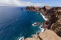 De golven van een blauwe zee breken tegen de rotsen van de vulkanische bergen van het Portugese eiland Madeira