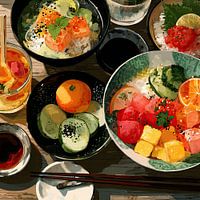 Dit kunstwerk toont een kleurrijk tafelbeeld van Aziatisch gerechten. Op de voorgrond staan verschillende kommen gevuld met rijst, rauwe vis, fruit en groenten. Er is zalm, tonijn en mango te zien, gecombineerd met schijfjes komkommer, citrus en verse kruiden. De gerechten zijn zorgvuldig opgemaakt en versierd met zwarte sesam. Rondom de kommen staan kleine schaaltjes met saus, een glas met fruitdrank en houten eetstokjes. De tafel is van licht hout, wat warmte en rust toevoegt.