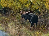 Foto van een kapitale elandstier (Moose, Alces alces) met een groot gewei aan de rand van de Maligne Road in Jasper National Park, Alberta, Canada in de Rocky Mountains tijdens de bronsttijd in de herfst met geel verkleurende bomen op de achtergrond.