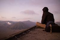Een backpacker die Onderstel Bromo, Oost-Java, Indonesië overziet, tijdens vroege ochtendzonsopgang. We zitten bovenop een kleine schuilplaats om een beter zicht te krijgen.