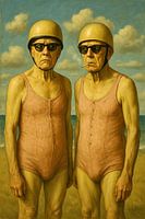 Surrealistische kunstprint van twee oudere mannen in vintage badpakken met helmen, staand op een strand. Magritte-achtige stijl, humoristisch en vervreemdend. Retro, poëtisch en origineel. Perfect voor aan de muur.