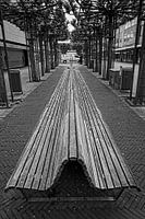 Strakke vormgeving van deze bank, passend bij de architectuur van de omliggende warenhuizen op de Promenade van Heerlen
