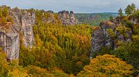 Een weids 16:9 panorama beeld gezien vanaf de Basteibrucke in de herfst met volop herfstkleuren bij de Bastei in het nationale park Saksisch-Zwitserland. Op een hoogte van 194 meter boven de Elbe heb je vanop het rotsplateau een prachtig uitzicht over enkele tafelbergen en het tegenover liggend dorp Rathen.