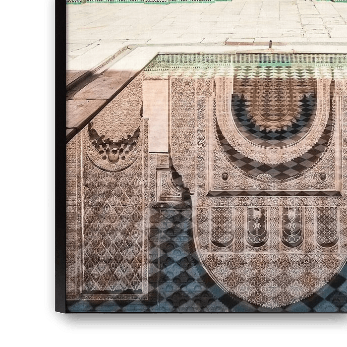 De Ben Youssef Madrasa koranschool in Marrakech, Marokko. Een prachtig voorbeeld van islamitische architectuur gebouwd rond 1570. De structuren van de gebouwen reflecteren in de vijver op de voorgrond.