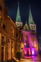 De Bergkerk en de Bergstraat in het paars in de avond.