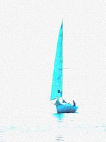 Een blauw jacht vaart uit de lage mist op het Lago Trasimeno in Umbrië, Italië. Het blauw van de boot contrasteert met de dofheid van de omgeving. Het geeft een griezelig gevoel als het jacht tevoorschijn komt. Over een uur zal de hete zon de mist wegbranden en zullen het meer en de lucht weer diep turquoise zijn. Maar voor nu is de enige kleur die van het blauwe jacht.