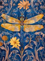 De libelle, met haar transparante, geaderde vleugels gespreid, lijkt te zweven boven een bed van bloemen en planten. De dominantie van blauwe en gouden tinten geeft het…
