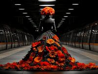 Laat je interieur stralen met deze indrukwekkende muurdecoratie: een vrouw rijst op uit het hart van de stad, haar vurige bloemenjurk als een altaar van kleur in een kathedraal van beton en licht. De dramatische zwarte top en expressieve bloemen vormen samen een krachtig kunstwerk dat perfect past in een luxueus hotel, moderne hal of als artistiek statement piece in je woonkamer.