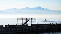 De stilte van het Bodenmeer voor het seizoen begint en alles lijkt nog steeds leeg en rustig. Op de achtergrond de Zwitserse bergen met de Säntis en langs de kustlijn opkomende grondmist voordat de zon sterker schijnt. En net in de ochtend na 10-15 min. kan dit panorama van de Bodensee er heel anders uitzien waar slechts één schip op…