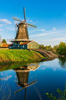 De Bolwerksmolen bij Deventer, Overijssel. De zaagmolen uit 1863 staat in het licht van de ondergaande zon. De molen wordt in het water weerspiegeld.