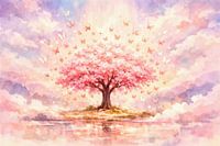 Een weelderige kersenboom staat op een klein eilandje omgeven door water, met een zachte reflectie op het oppervlak. De algehele sfeer is dromerig en etherisch, gedomineerd door zachte tinten roze, lavendel en wit. Talloze roze vlinders vliegen rond de boom en stijgen op in een straal van licht die door de lucht breekt. Het is een…