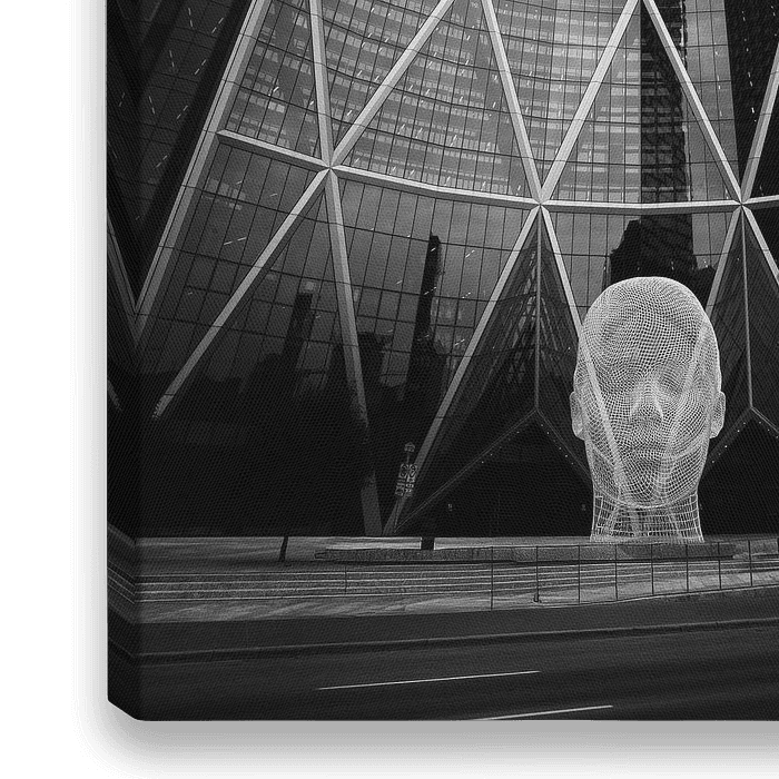 De wolkenkrabber "The Bow" in Calgary met het hoofdsculptuur op de voorgrond.