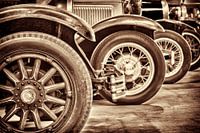 Sepia foto van een Buick en Ford model T's