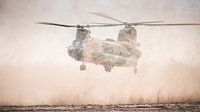 De Chinook van de Koninklijke Luchtmacht landend in het stof.