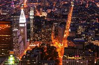 Links ziet u de 200 m hoge Clocktower, in het midden het Flatiron Building, waar Broadway en 5th Avenue elkaar kruisen.