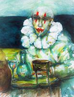 Clown/ Pierrot / Circus / Voorstelling/ Circusvoorstelling / Geschminkt / Wit geschminkt / Kraag / Witte kraag / Rode lippen / Blauwe uurtje / Uitrusten / Drinken / Wijn/ Tafeltje / Glas / Sigaret/ Roken / Illustratie / Mixed Medium / Aquarel / Wit / Gouache verf/ Blauw / Groen / Geel / Triest / Vrolijk / Humor /