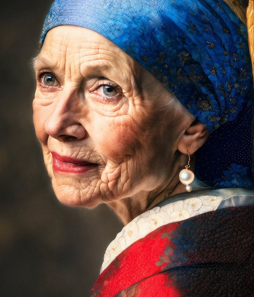 De oudere dame, met haar serene en indringende blik, straalt een unieke charme uit. Haar ogen, gevuld met levensverhalen en een vleugje nieuwsgierigheid, spreken direct tot de ziel van de kijker. De delicate blauwe doek die om haar hoofd is gedrapeerd, met subtiele patronen en een rijke textuur, voegt een extra dimensie toe aan het werk. De parel aan haar oor, een symbool van elegantie en tijdloze allure, verbindt heden en verleden, en versterkt de artistieke link met Vermeer's oorspronkelijke meesterwerk.