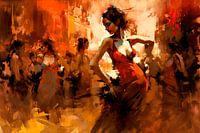In het hart van het kunstwerk bevindt zich een dansende vrouw in een opvallende rode jurk die vol passie beweegt. Haar bewegingen zijn levendig en meeslepend, en nodigen de toeschouwer uit om deel te nemen aan haar uitbundige viering van het leven. Naarmate het schilderij zich van haar uitstrekt, wordt het steeds abstracter, waardoor de focus automatisch naar de danseres wordt getrokken en haar onmiskenbare présence benadrukt.