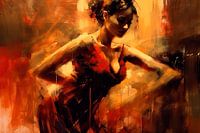 In het hart van het kunstwerk bevindt zich een dansende vrouw in een opvallende rode jurk die vol passie beweegt. Haar bewegingen zijn levendig en meeslepend, en nodigen de toeschouwer uit om deel te nemen aan haar uitbundige viering van het leven. Naarmate het schilderij zich van haar uitstrekt, wordt het steeds abstracter, waardoor de focus automatisch naar de danseres wordt getrokken en haar onmiskenbare présence benadrukt.