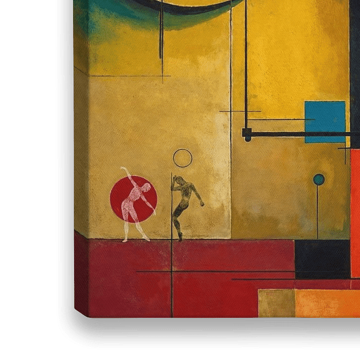 Geometrie, ritme en kleur komen samen in De Dans van Kandinsky — een levendig werk waarin abstractie en menselijke expressie elkaar ontmoeten. Op een dynamische, AI-gegenereerde achtergrond, digitaal ingeschilderd in heldere kleurvlakken en grafische compositie, bewegen zich twaalf unieke 3D-renders van dansers.