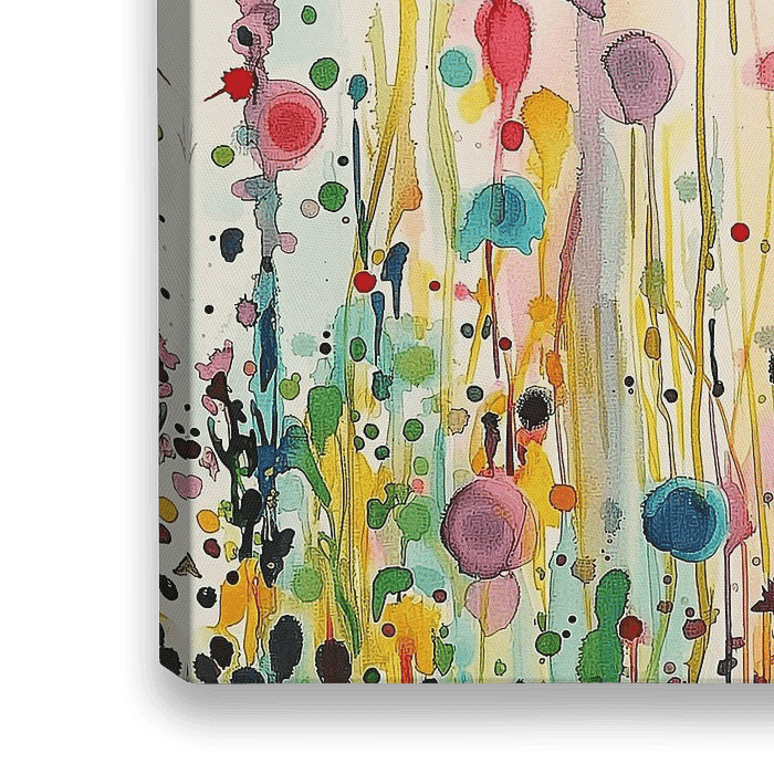 Kleurrijke abstracte weergave van de natuur. Het middelpunt is een rode vogel, zittend op wat lijkt op een tak, omgeven door een wilde explosie van kleuren en vormen. De achtergrond is opgebouwd uit talloze druppels, vegen en stippen die samen een gevoel van een bloeiend veld of weide oproepen. De kleuren variëren van warm rood en zacht…