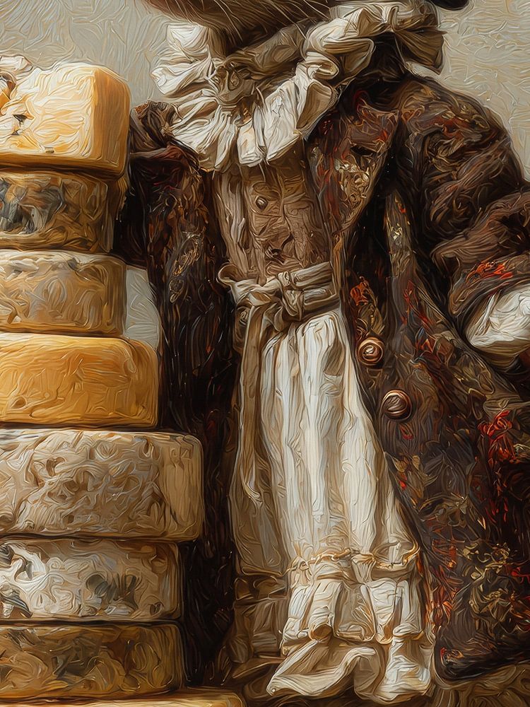 Deze speelse schildering toont een muis in rijk gedetailleerde 18e-eeuwse kleding, trots poserend naast een toren van ronde kazen. De warme tinten, verfijnde details en humoristische compositie zorgen voor een unieke blikvanger met een knipoog naar oude meesters.