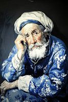 Een krachtig en introspectief portret van een oudere man, gehuld in een rijk versierde blauw-witte mantel die doet denken aan Delfts blauw aardewerk. Zijn hand rust tegen zijn slaap, zijn blik naar binnen gekeerd — alsof hij verzonken is in herinnering of reflectie. De schilderachtige penseelvoering en het clair-obscur-licht versterken het dramatische en intieme karakter van dit kunstwerk. Perfect voor een ruimte waar diepte, geschiedenis en menselijke emotie samenkomen.