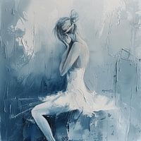 In dit prachtige schilderij zien we een vrouw in een elegante witte jurk, omringd door een overwegend blauwe achtergrond. Haar houding straalt een diepe emotionele kwetsbaarheid uit, iets dat veel mensen zullen herkennen.