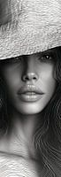 Ontdek de intrigerende schoonheid van De Diepte van Stilzwijgende Schoonheid, een meesterlijke lijnkunst die een prachtige vrouw met een grote, elegante hoed portretteert. Deze tekening vangt de essentie van subtiele verfijning en tijdloze elegantie, waarbij de vrouw met een mysterieuze blik net onder de rand van haar hoed vandaan kijkt. De lijnen van de hoed en het haar creëren een harmonisch spel van textuur en diepte, terwijl de gedetailleerde weergave van de lippen en de ogen een gevoel van emotie en leven toevoegen aan het kunstwerk.