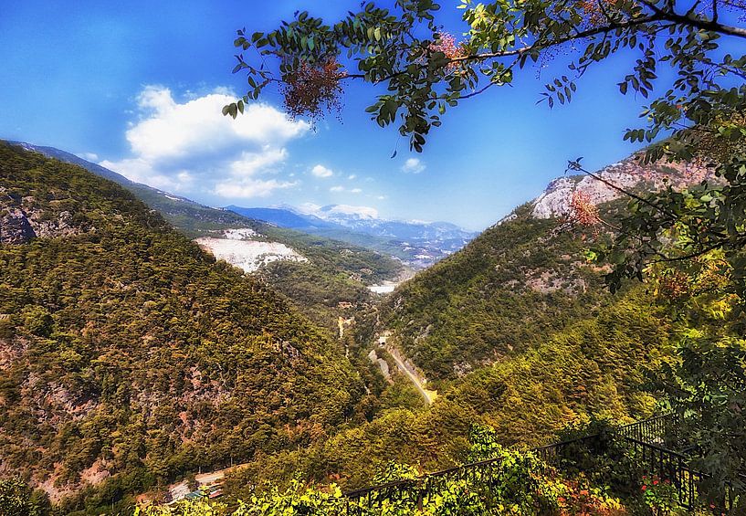 Deze foto vangt de Dimcay‑vallei in Turkije op een manier die voelt alsof je er zelf staat: een kronkelende weg die zich elegant door het groene landschap slingert, heuvels die in zachte lagen tegen elkaar leunen, en een horizon die langzaam vervaagt in blauwige bergtoppen.