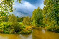 De Dinkel in Twente kronkelt door het herfstlandschap met kleurrijke bladeren aan de bomen en wolken in de lucht op de achtergrond. De Dinkel ontspringt in Noordrijn-Westfalen, Duitsland, en stroomt noordwaarts naar Gronau, steekt de grens met Nederland (Overijssel) over, stroomt door Losser, Denekamp, en gaat weer de grens over naar…