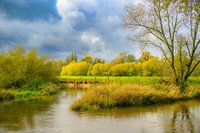 De Dinkel in Twente kronkelt door het herfstlandschap met kleurrijke bladeren aan de bomen en wolken in de lucht op de achtergrond. De Dinkel ontspringt in Noordrijn-Westfalen, Duitsland, en stroomt noordwaarts naar Gronau, steekt de grens met Nederland (Overijssel) over, stroomt door Losser, Denekamp, en gaat weer de grens over naar Duitsland (Nedersaksen) om in Neuenhaus in Duitsland samen te komen met de Vechte.