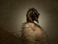 Het hoofd met de nek statig naar achteren gebogen, een kraag van veren rond die nek welke je vaak bij een diva uit de jaren dertig of veertig ziet.
