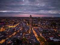 De iconische Domtoren in Utrecht torent boven de stad Utrecht uit tijdens een zonsopkomst.