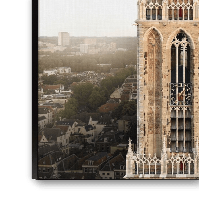 Na jaren van restauratie, waarin de beroemde Utrechtse Domtoren grotendeels verscholen ging achter steigers, staat het icoon van de stad weer stralend in het avondlicht. Vastgelegd tijdens een adembenemende zonsondergang, baadt de toren in warme, gouden tinten. De foto is samengesteld uit meerdere opnames, waardoor de resolutie uitzonderlijk hoog is en elk detail – van de sierlijke ornamenten tot de verweerde stenen – haarscherp zichtbaar wordt.