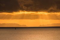 De doorkijk tussen 2 eilanden door met een fantastische zonsopgang... (zie je ook het bootje?)