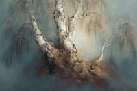 Dromerig olieverf-kunstwerk van drie witte berken met roestige vlekken in zachte mist, ideaal als serene boswanddecoratie.
