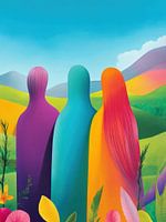 In dit kleurrijke werk ontmoet je drie mysterieuze figuren die uitkijken over een levendig, glooiend landschap. Elk van hen is gehuld in een glad, vloeiend kleurvlak – paars, turquoise en oranje – waarbij de rechterfiguur opvallend lang rood haar heeft. Het werk ademt sereniteit, verbondenheid en een zacht gevoel van…
