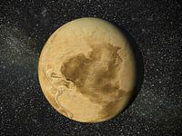Hoe zou de Aarde er uit zien als ineens al het water zou verdwijnen? Als een soort kruising tussen de Maan en Mars. We zien hier, tegen een achtergrond van sterren, die droge versie van onze planeet; een zandkleurige bol met in het midden het Atlantisch bekken en aan weerszijden daarvan Noord- en Zuid-Amerika en delen van Afrika en Europa.